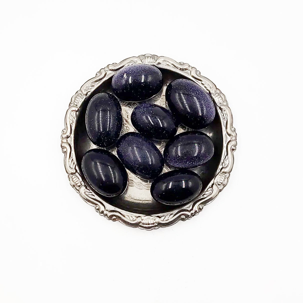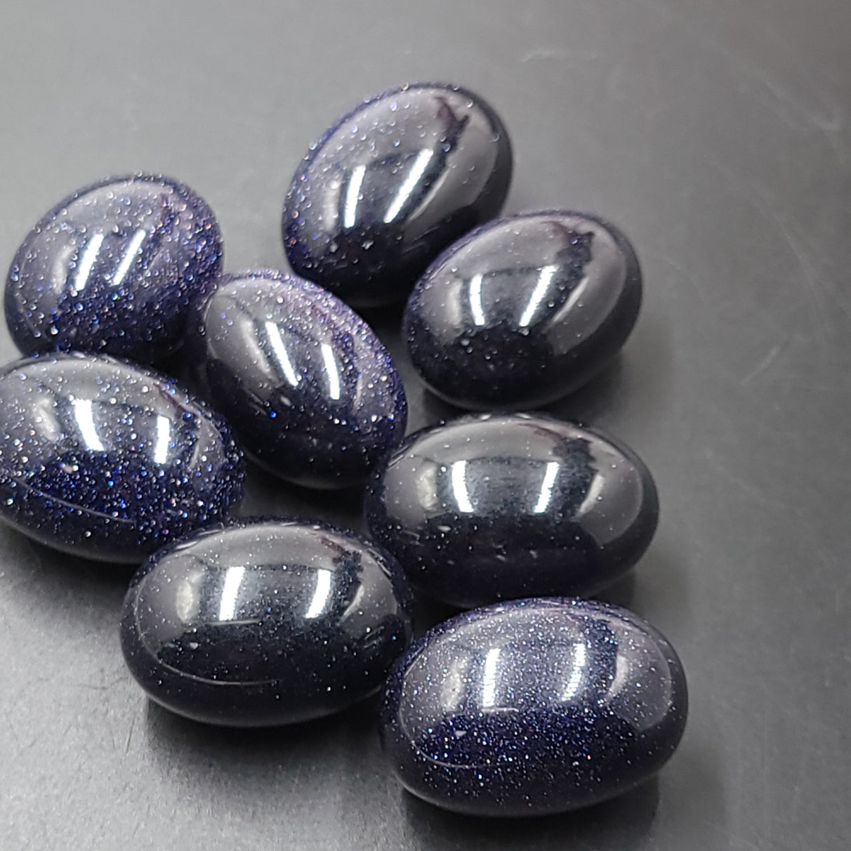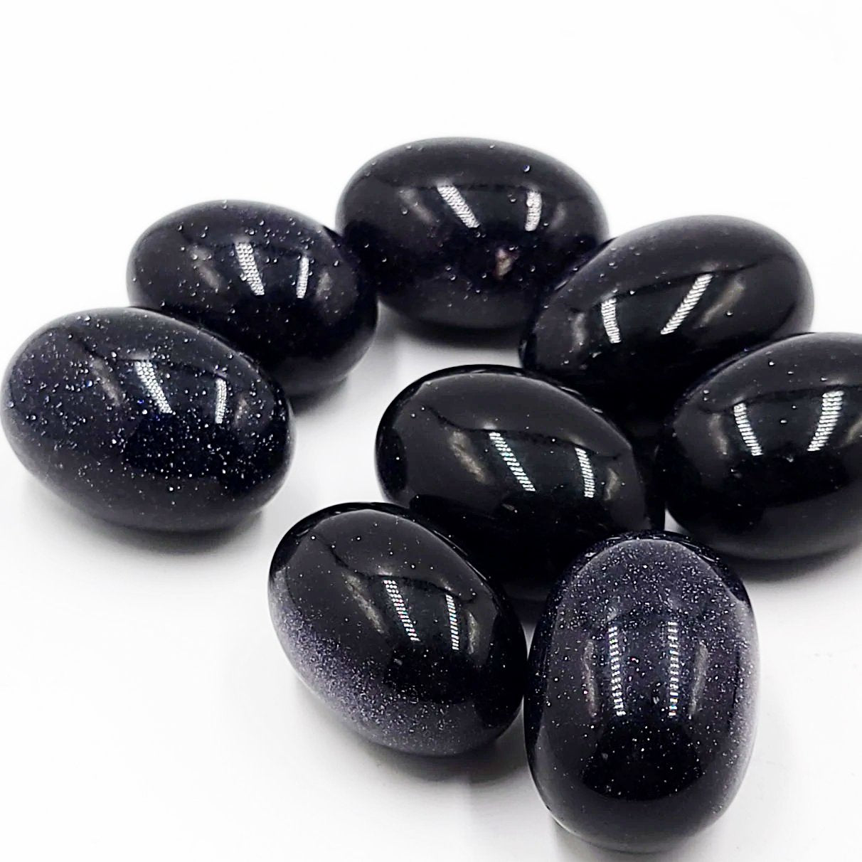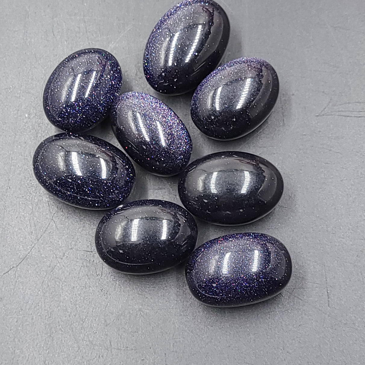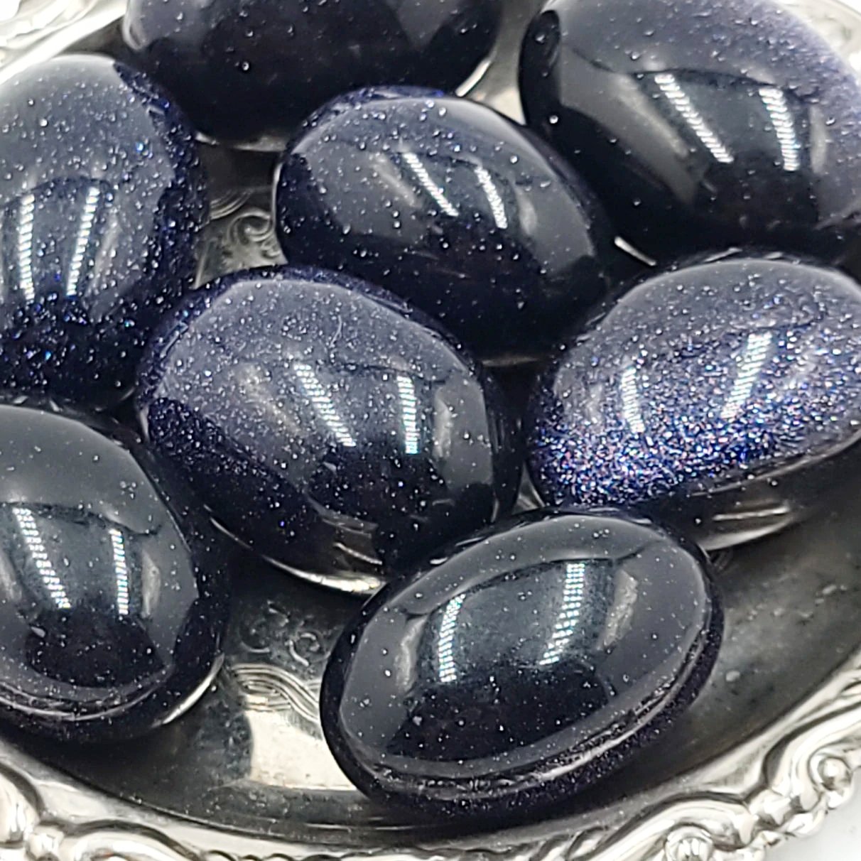 Goldstone, or Sandstone, is a man-made glass infused with copper particles; the additions of cobalt, manganese or chromium result in the deep, shimmery Blue Goldstone.