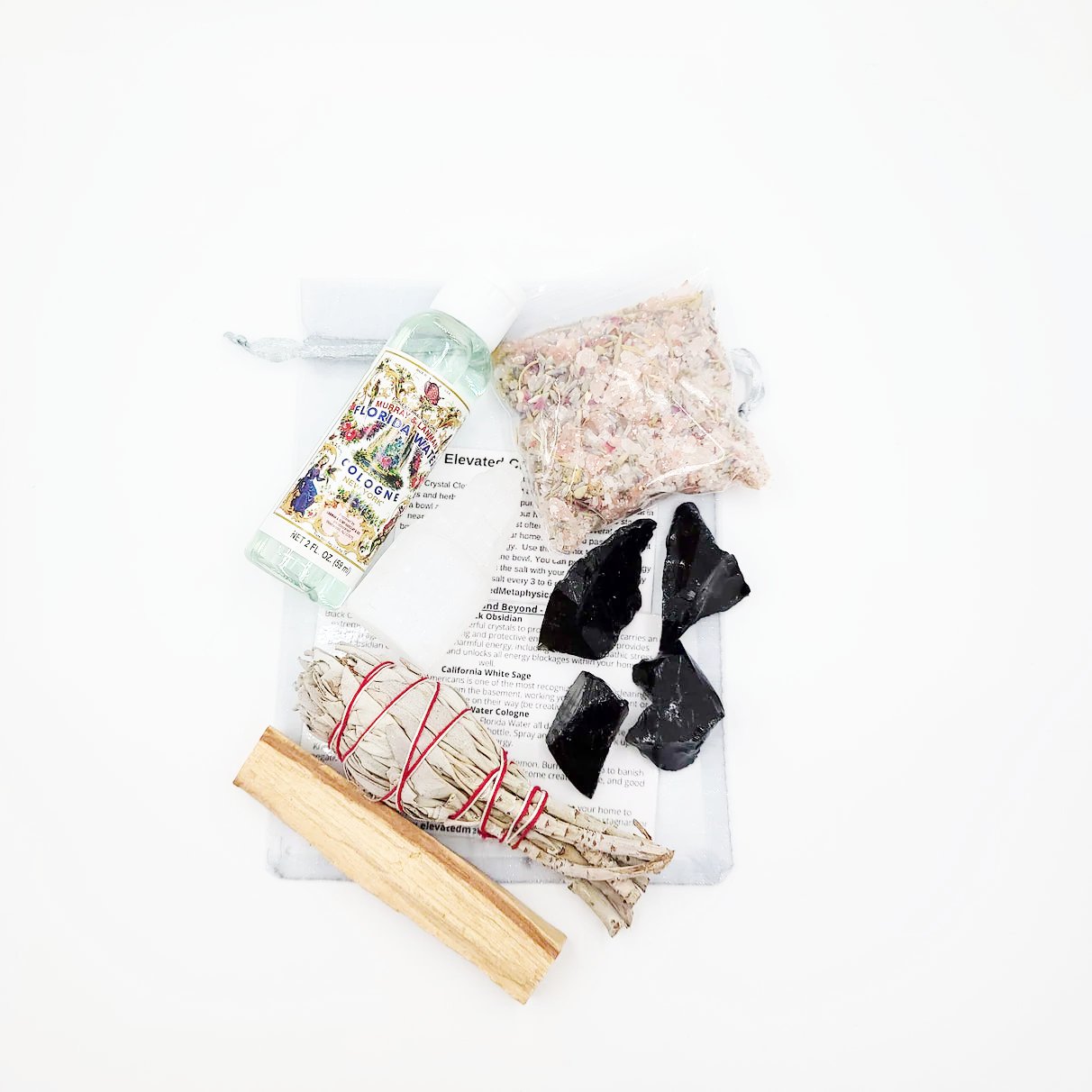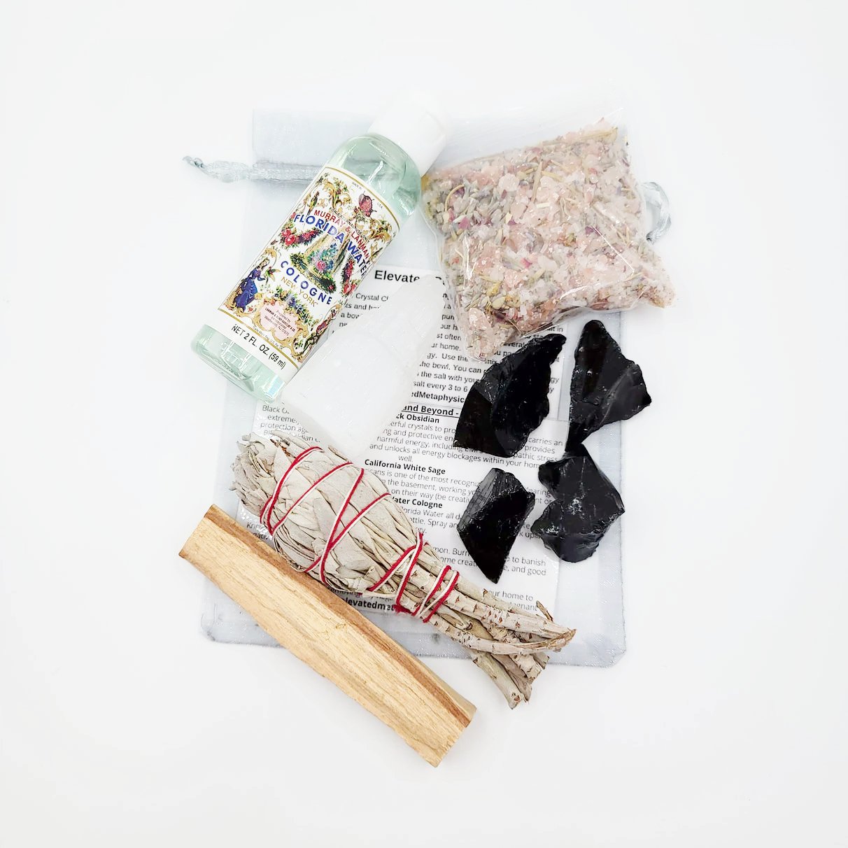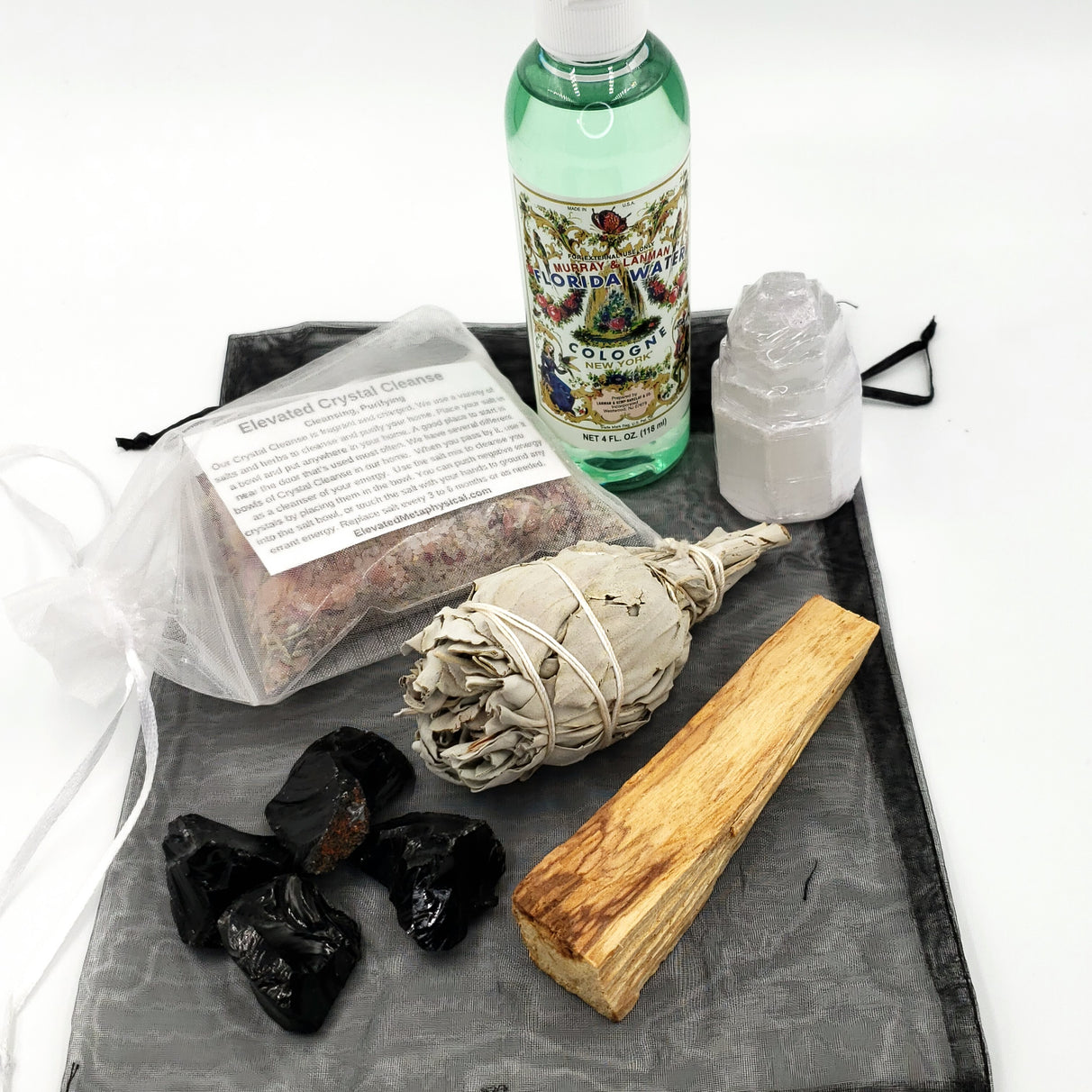 Stone set includes a 2" Selenite tower, four Black Obsidian pieces, one Palo Santo stick, one 3" Sage torch, one bottle of 2 oz Florida water, one bag of 2 oz Elevated Crystal Cleanse, a sheer pouch, and an information card.
