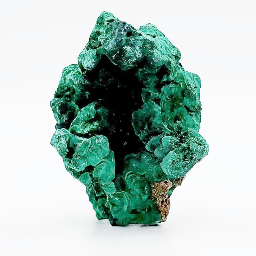 Malachite is a bright green crystal with swirls of deeper, darker green throughout. It is opaque, with a glassy, silky luster. In its natural form, Malachite may appear dull and earth-toned or velvety and fibrous.