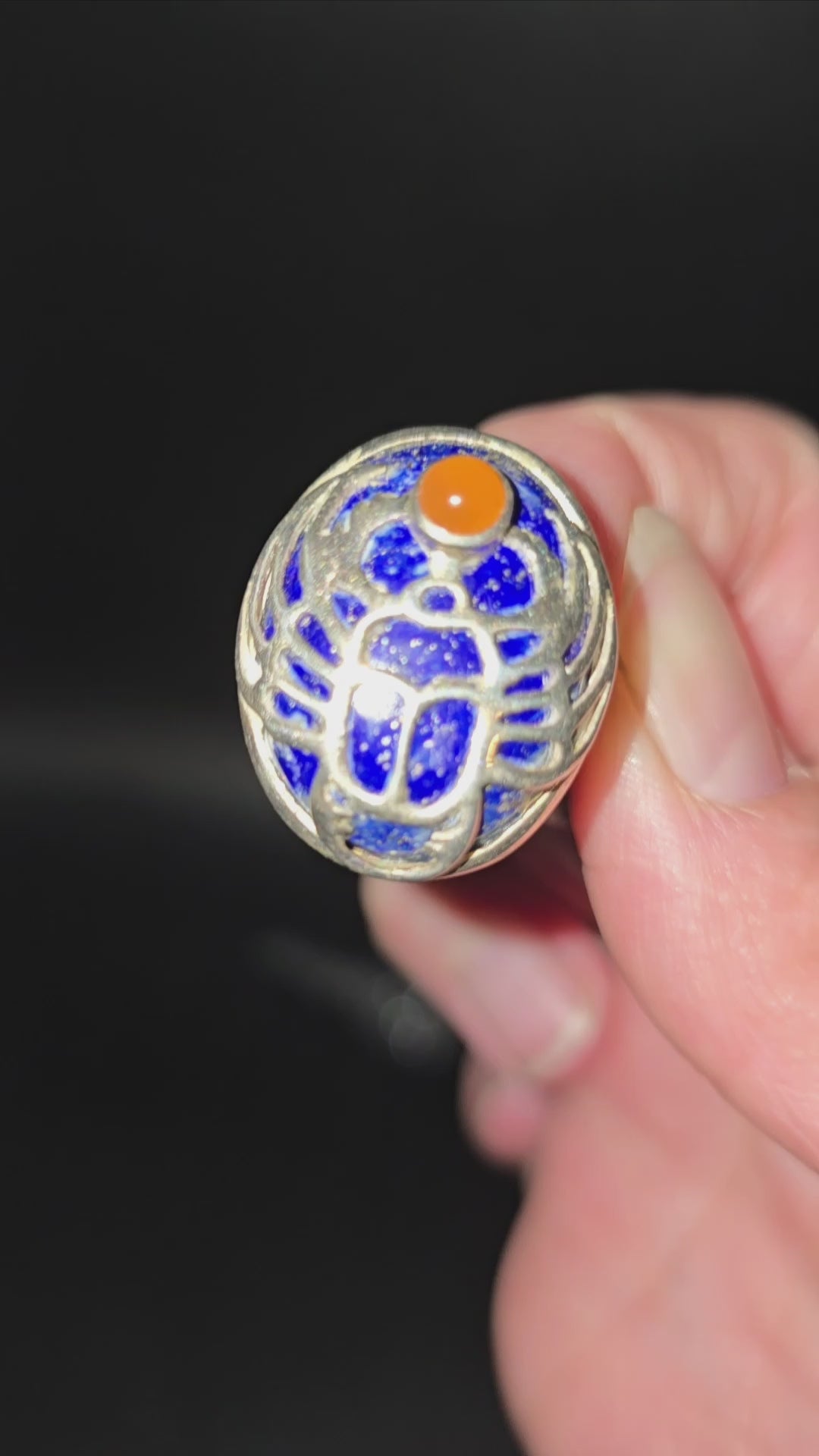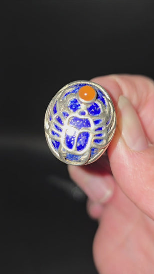 Powerful, symbolic, and beautifully handcrafted, this sterling silver scarab ring features deep royal lapis lazuli framed beneath an ornate silver scarab design, accented with a vibrant carnelian cabochon. This bold size 9 statement ring carries ancient energy and modern artistry, making it a truly unforgettable piece.